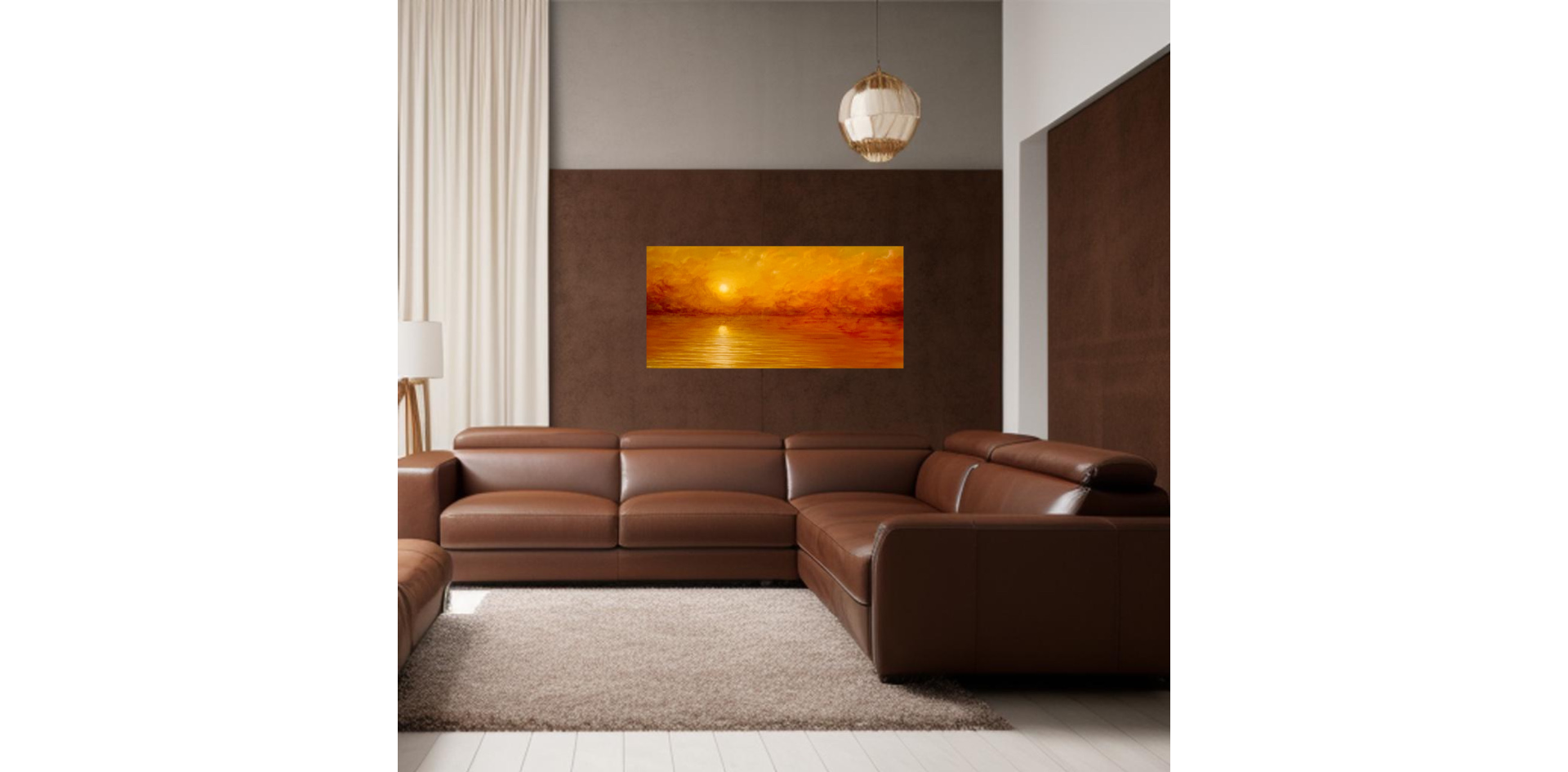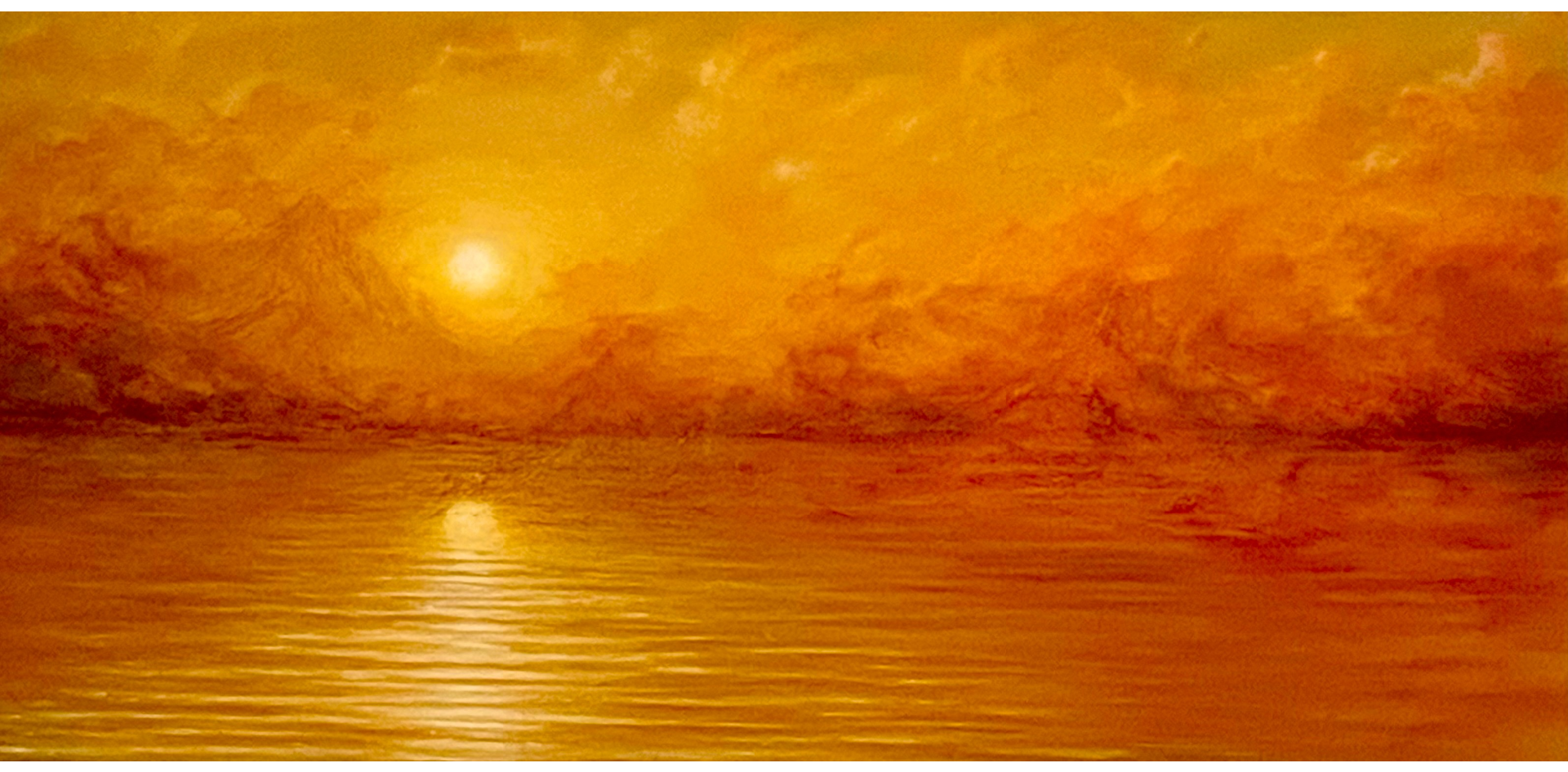Let There Be Light captures the first, all-encompassing moment of creation when light triumphantly breaks through the boundaries of darkness. The radiant golden clouds and the mirrored water surface together symbolize both the beginning of life and the awakening of the soul. The painting’s message is that light not only transforms the landscape but also opens new horizons within us. This is a moment of revelation, clarity, and the celebration of creation.